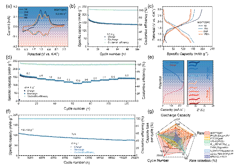 图3. BQXTO-HC全电池的性能评估。(a) 全电池在0.2 mV s-1扫描速率下的CV曲线;(b) 在0.2 A g-1电流密度下的循环性能;(c) 充放电曲线;(d) 倍率性能;(e) 不同电位下的原位EIS测试;(f) 在10 A g-1电流密度下的长期循环稳定性测试;(g) BQXTO||HC全电池与文献中代表性钾离子全电池的性能对比。