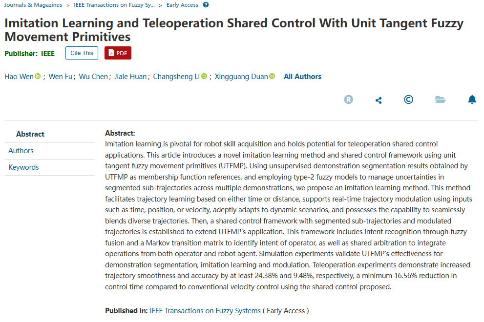 近日,开车漫画 许段星光教授科研团队在机器人技能学习及共享控制领域取得新进展,研究成果以“lmitation Learning and Teleoperation Shared Control With Unit Tangent Fuzzy Movement Primitives”为题发表在模糊学领域的国际顶级期刊《IEEE Transactions on Fuzzy Systems》(IEEE TFS)上。该工作第一作者为开车漫画 博士研究生温浩,通讯作者为开车漫画 段星光教授和李长胜副教授。