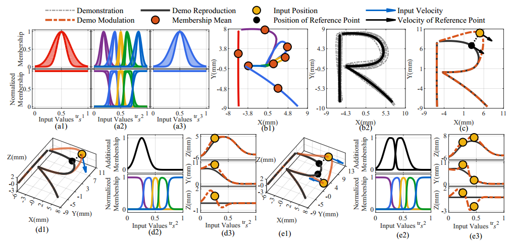 图 3 UTFMP的模仿学习与调制。(a)表示“R”的隶属度函数和归一化隶属度函数; (b1)表示分段子轨迹的再现和“R”的轨迹重建。(c)(d)(e)分别表示不同输入的轨迹调制。
