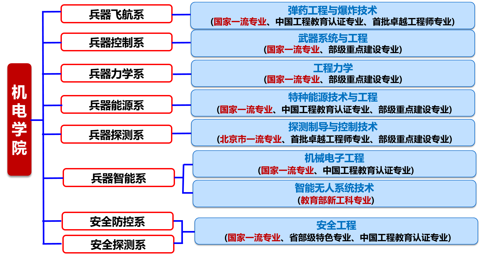 学院主持建设有兵器科学与技术、安全科学与工程两个一级学科,以及机械电子工程、工程力学两个二级学科。兵器科学与技术学科2007年成为首批国家重点一级学科,在历次学科评估中全国排名第一,2017年入选国家“世界一流学科”建设行列;安全科学与工程学科,于1985年正式招收安全工程本科专业, 2019年获批“博士后流动站”,2022年在“软科中国大学专业排名”进入前五。工程力学、机械电子工程两个国家重点二级学科支持了力学、机械工程国家重点一级学科的建设。