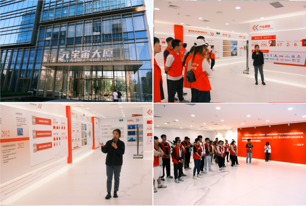 调研团队师生在经开区元宇宙大厦,跟随相关负责人探索了这个集数字产业创新基地、数字文化产业园、数字健康产业园于一体的展示交流中心。作为招商引资、投资促产和产业经济发展的主阵地,师生们在这里见识到了首都城市风貌与经济形象的新名片。交流过程中,青年学生们了解到,区政府推出的《大兴区关于促进大兴经济开发区数字经济发展暂行办法》为相关产业提供了政策支持和技术帮扶,助推建设了这座千亿级数字创新示范区。未来会有更多城市将“元宇宙”与工业、文旅、教育、医疗、安全等产业进行融合创新,结合“数字中国,网络强国”战略,不少学生表示,未来将为把北京打造成一座全球数字经济创新城市,贡献自己的青年力量。