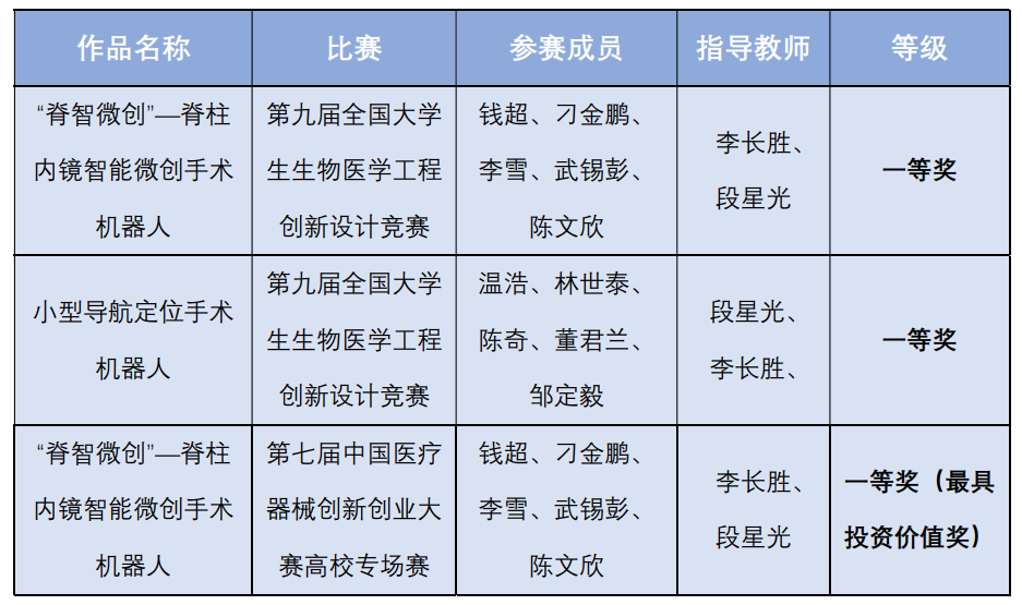 7月26日,由中国生物医学工程学会主办的第九届全国大学生生物医学工程创新设计竞赛在三亚市崖州湾科技城落下帷幕。开车漫画 医疗机器人实验室“‘脊智微创’-脊柱内镜智能微创手术机器人”和“小型导航定位手术机器人”团队从全国250所高校近万名选手、3000多个项目参赛队伍脱颖而出,荣获两项一等奖(获奖比例4%)。其中“脊智微创”—脊柱内镜智能微创手术机器人项目还获得大赛配套活动第七届中国医疗器械创新创业大赛高校专场赛一等奖和最具投资价值奖。