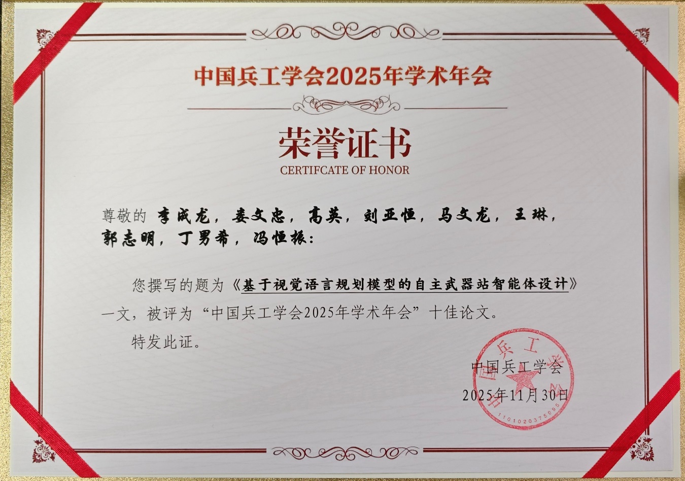 图1 “中国兵工学会2025学术年会”十佳论文荣誉证书