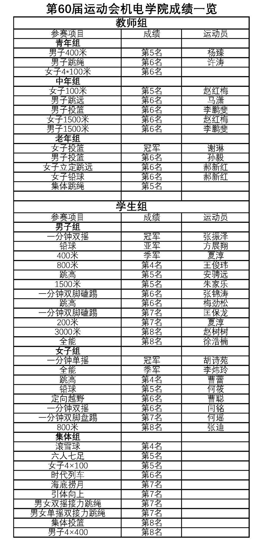 在本届赛事中,机电健儿们表现优异,充分展示了奋勇拼搏、勇攀高峰的体育精神。其中,教师组谢琳获得女子投篮老年组第1名,赵红梅获得女子100米中年组第5名,杨臻获得男子400米青年组第5名的成绩;学生组胡诗苑获得女子一分钟单摇第1名,张振泽获得男子一分钟双摇第1名,方展翔获得男子铅球第2名,李炜玲获得女子全能第3名的佳绩。在集体项目中,机电健儿们团结一致,默契配合,收获了滚雪球第4名,六人七足第5名的成绩。此次运动会中,教师组共在13个项目中取得名次,学生组共在30个项目中取得名次,较往年有明显进步。