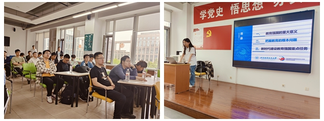 习近平总书记在党的二十大报告中指出,造就大批德才兼备的高素质人才,是国家和民族长远发展大计。这一观点体现了以习近平同志为核心的党中央对加快人才强国的战略谋划,对于全面建设社会主义现代化国家、实现中华民族伟大复兴的中国梦具有重大意义。本次聚焦“培养一流人才,建设科技强国”主题,邀请北航研究生宣讲团讲师进行宣讲,宣讲题目为《新时代迈向教育强国新征程》,勾致晴讲师从教育强国的重要意义、把握教育的根本问题、新时代教育强国重点任务等三方面进行介绍,号召党员同志们听党话、跟党走,以自身建设助力教育强国的建设。