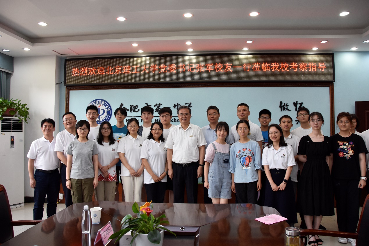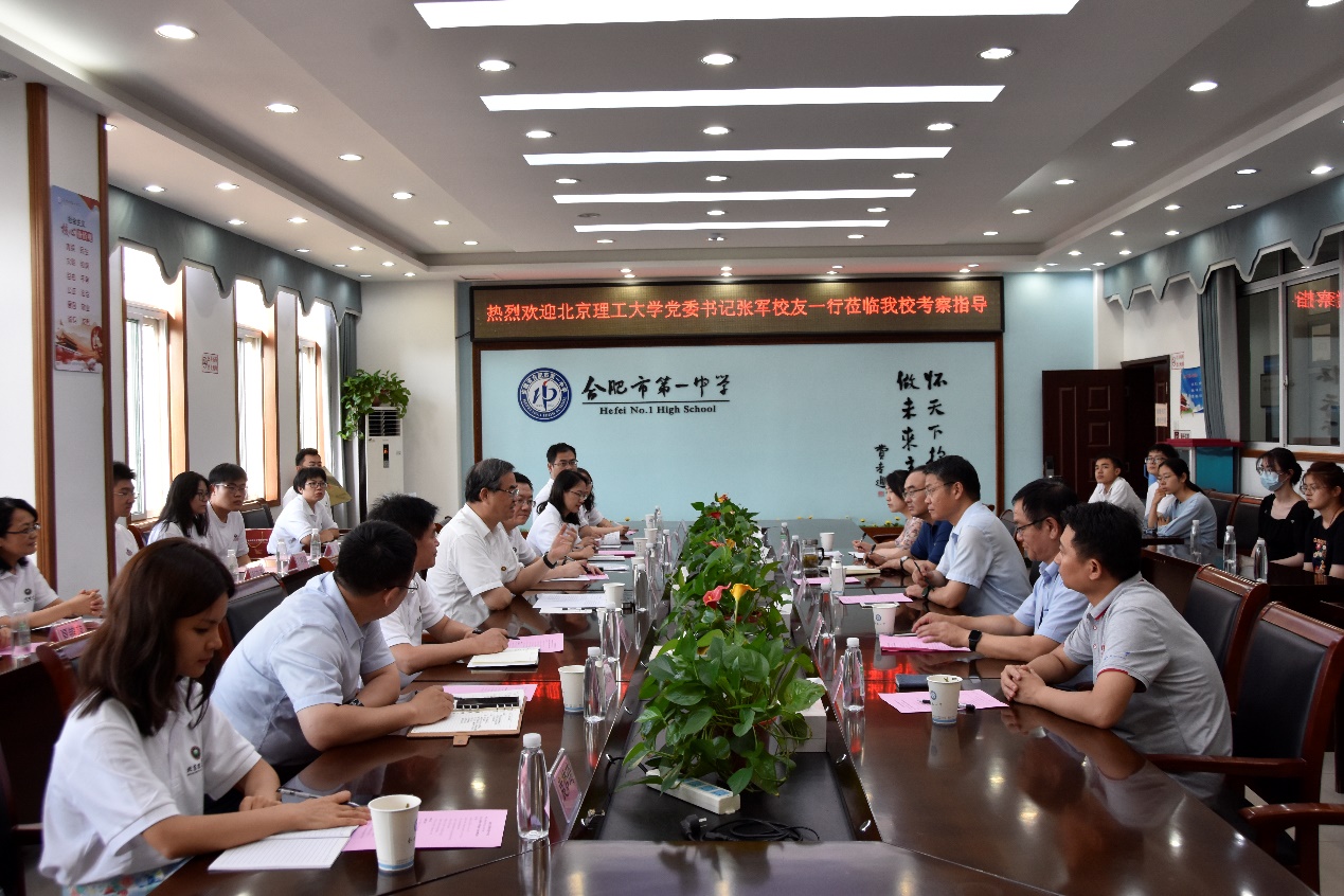 在合肥市第一中学,张军一行参观了合肥一中校史馆并开展调研交流。合肥一中校长封安保,副校长张大勇、胡晨、尤光雷,北理工——合肥一中家委会、思源学子和2023年报考生代表等参加座谈。