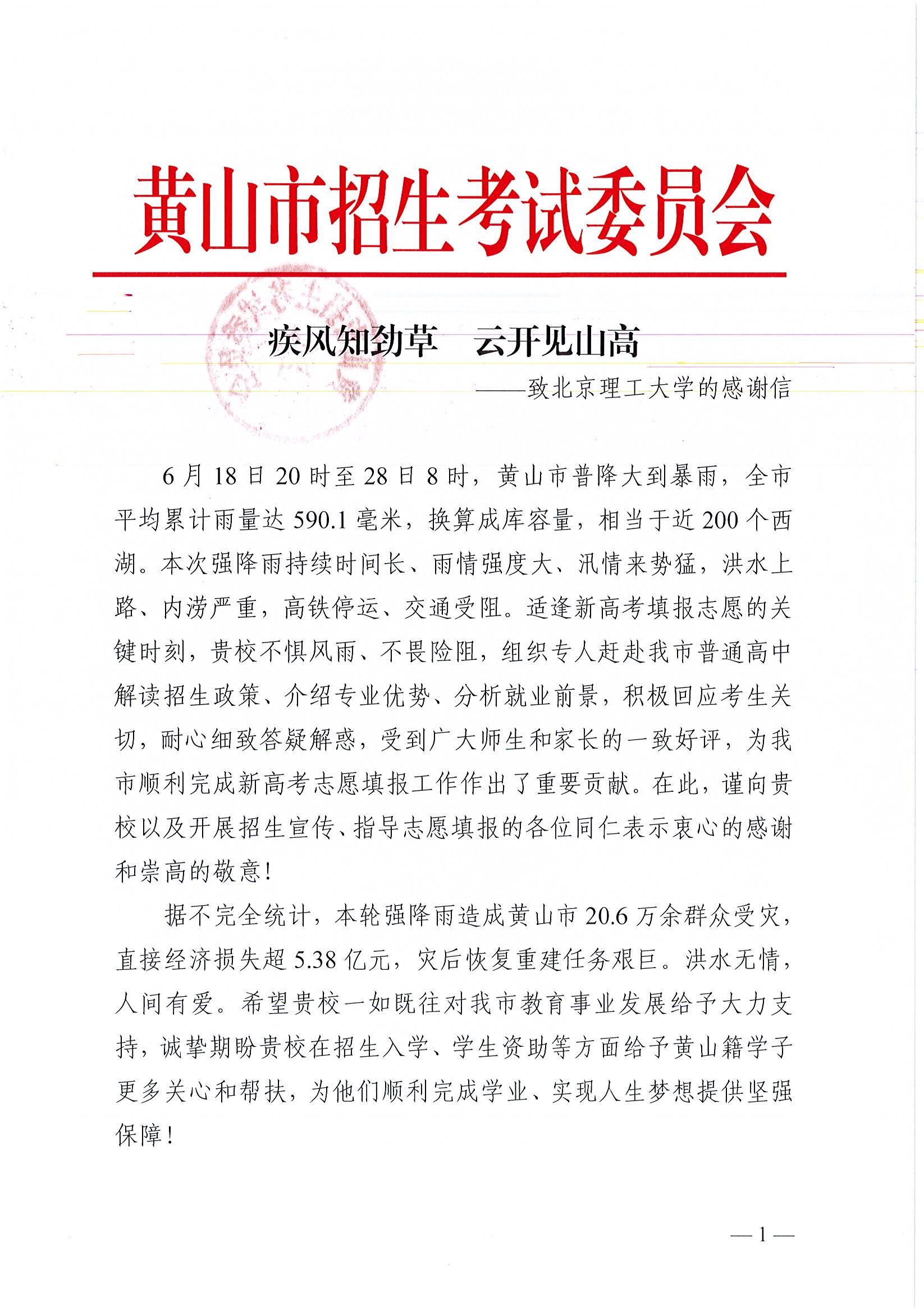 黄山市招生考试委员会向北理工安徽招生组发来感谢信2024-07-12 -